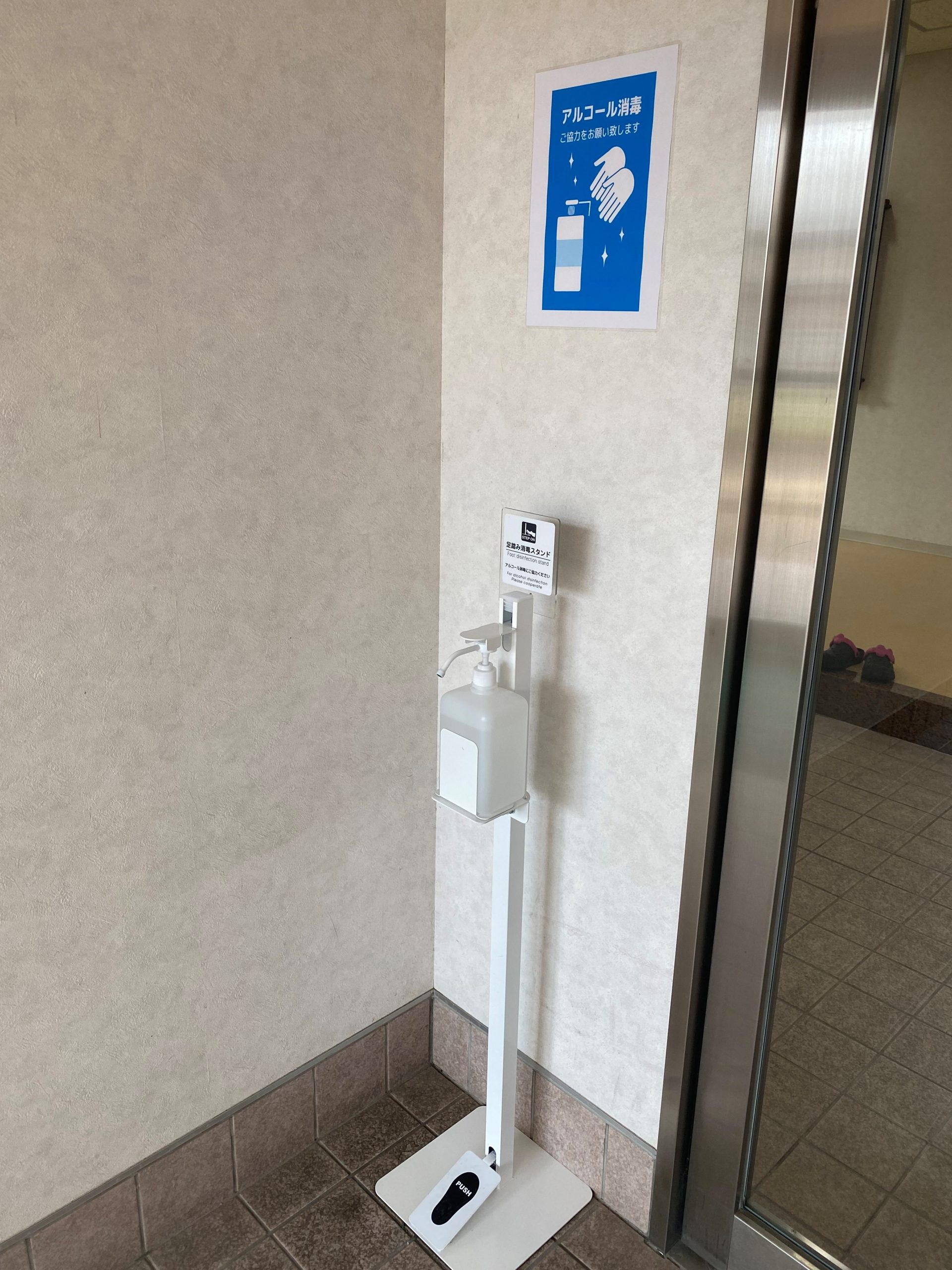 足踏みのアルコールスタンドや自動アルコールなど設置しております。