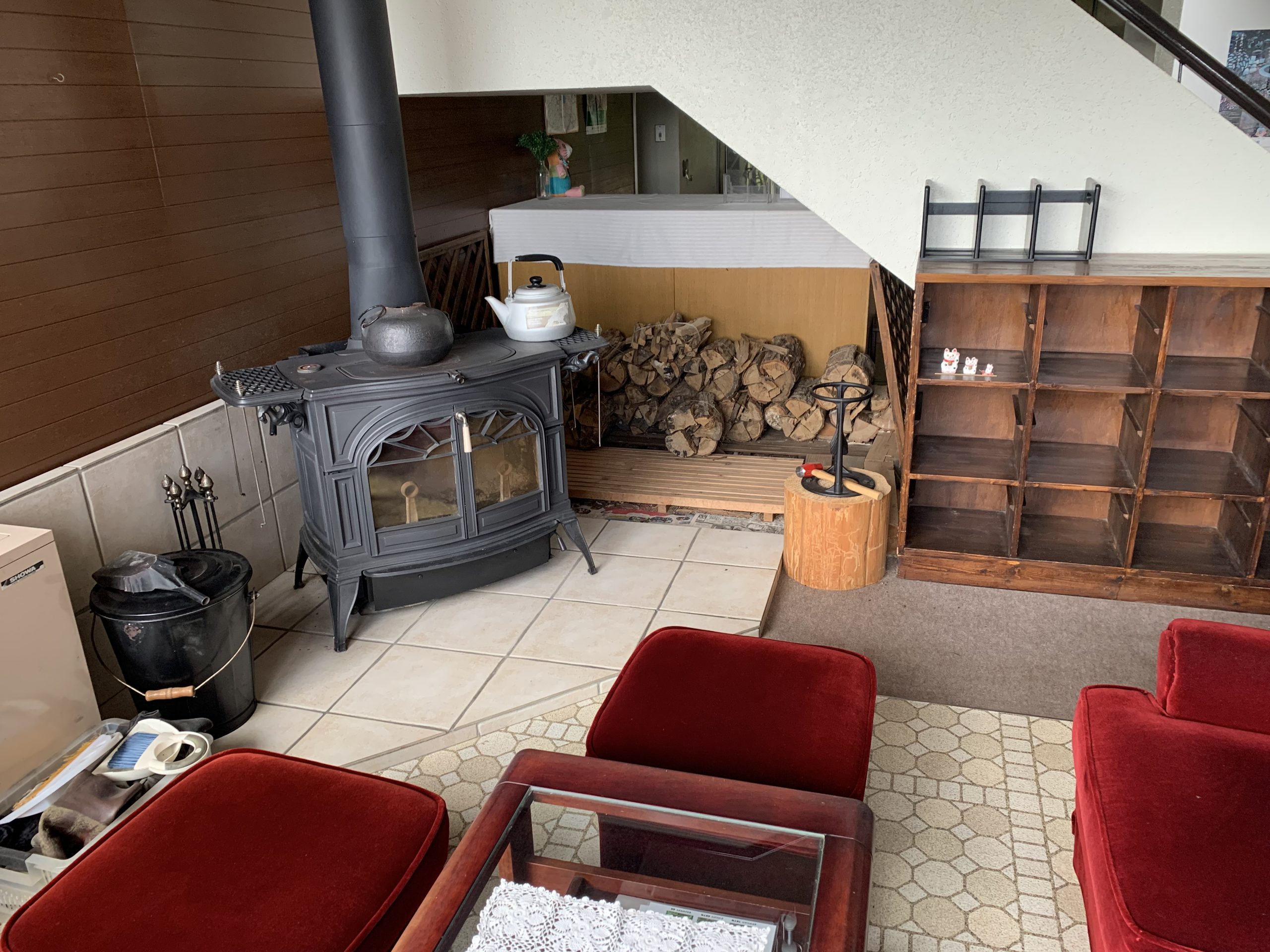 【ロビー】冬場は薪ストーブで暖が取れます