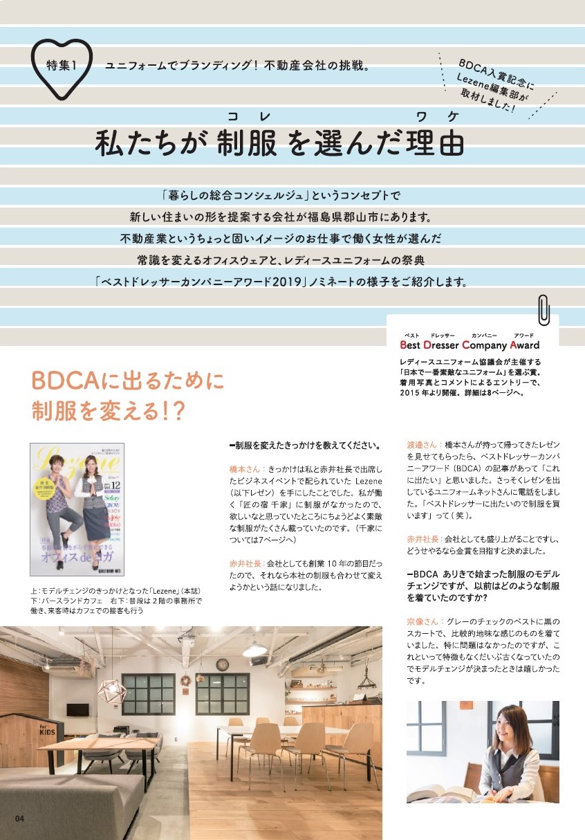きっかけは出席したビジネスイベントで配られていた、オフィスウェアの情報マガジン(Lezene)を手にしたことでした。そこには昨年のベストドレッサーカンパニーアワードの様子や受賞企業の素敵なユニフォームがたくさん掲載してありました。ちょうど「匠の宿 千家」の制服を探していたこともあり、それなら本社の制服も合わせて変えようかという話になりました。