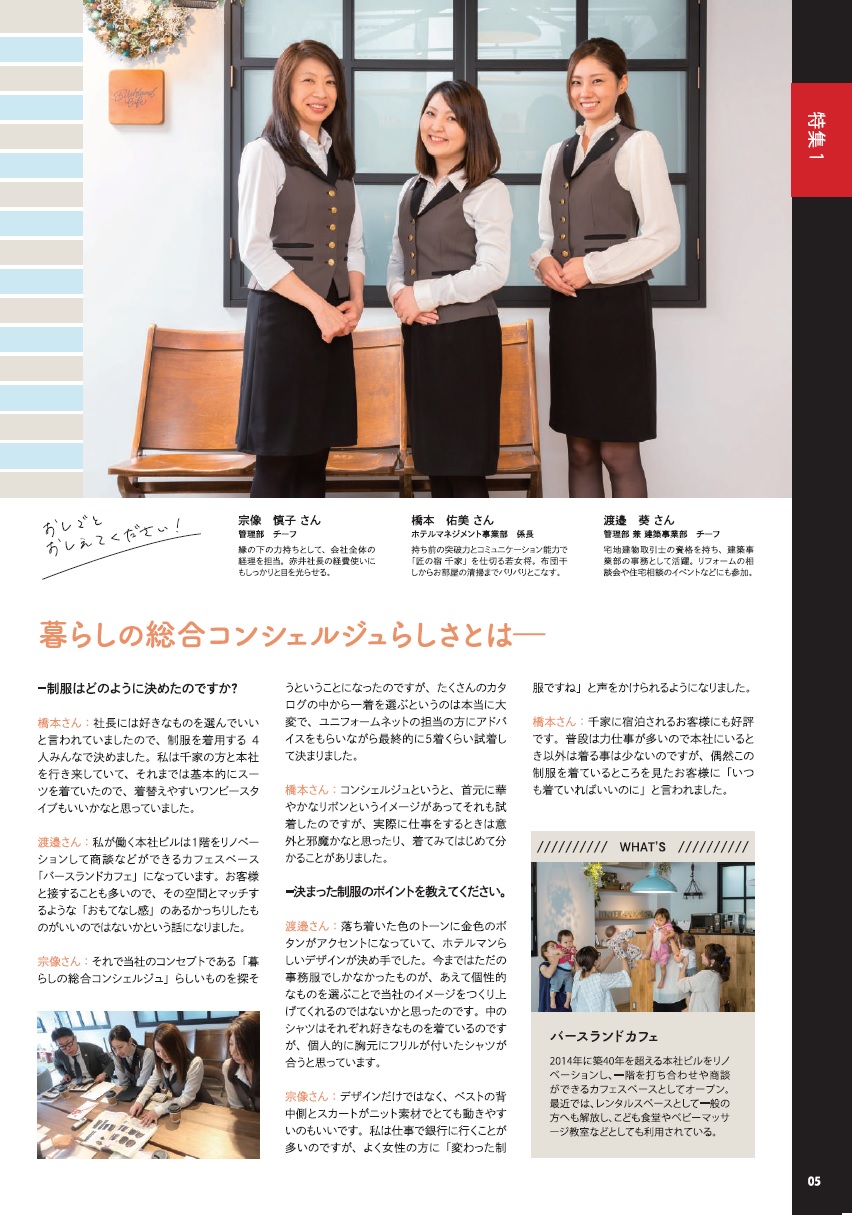 たくさんのカタログの中から一着を選ぶというのは本当に大変でした。それでも当社のコンセプトである「暮らしの総合コンシェルジュ」らしいものを、皆で意見を出し合いながら選びました。最終的に満場一致でバースランドにぴったりの一着に決まりました。