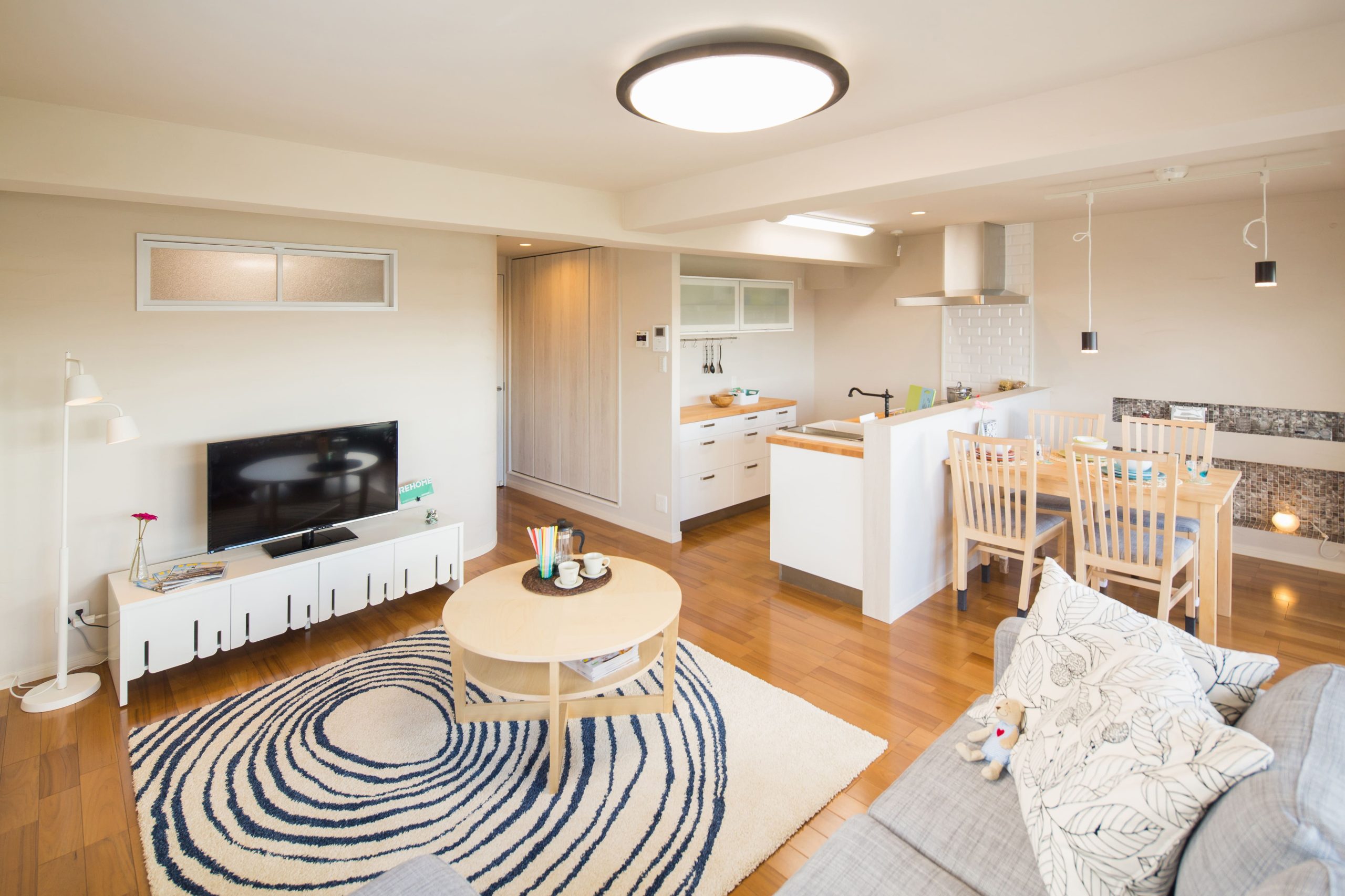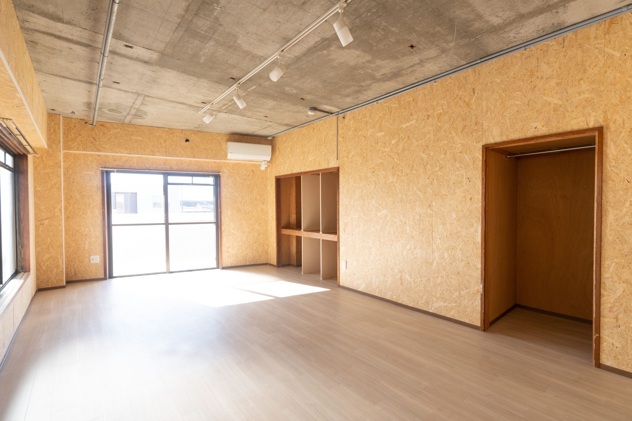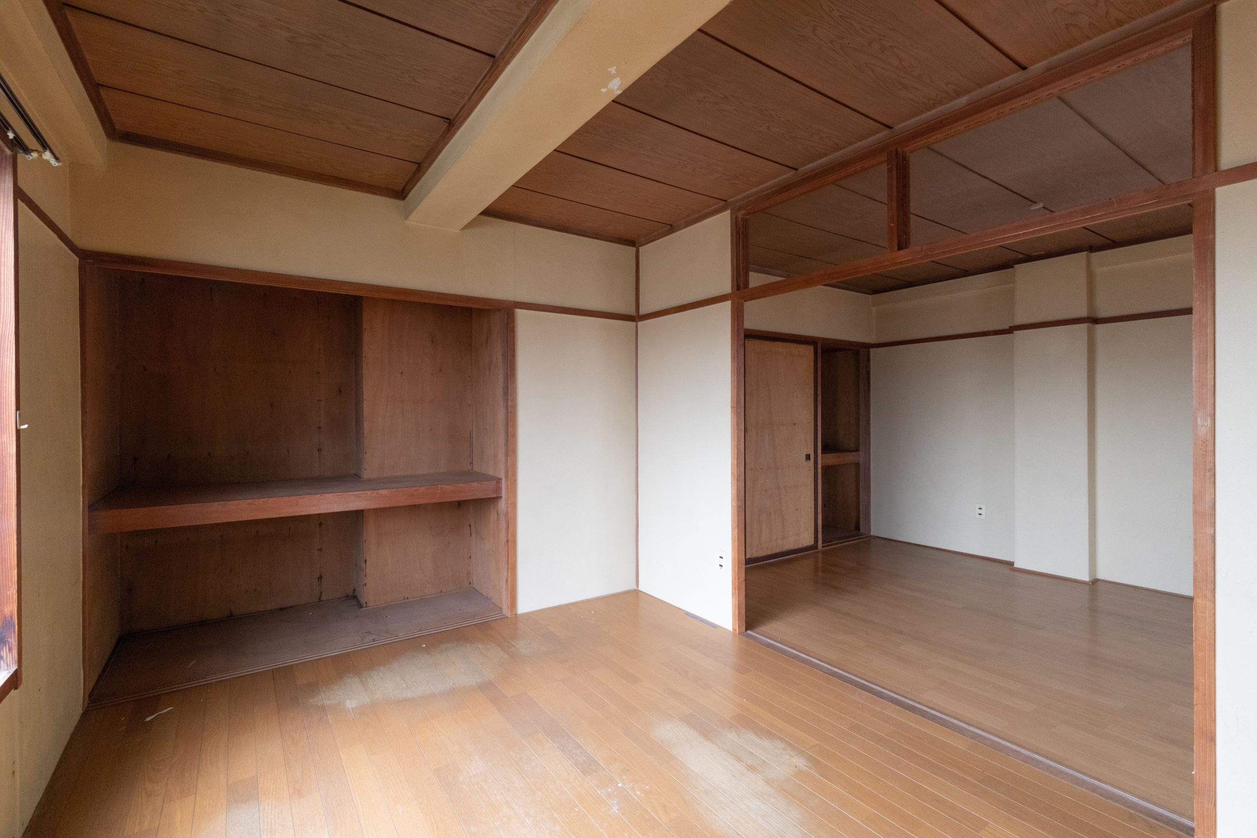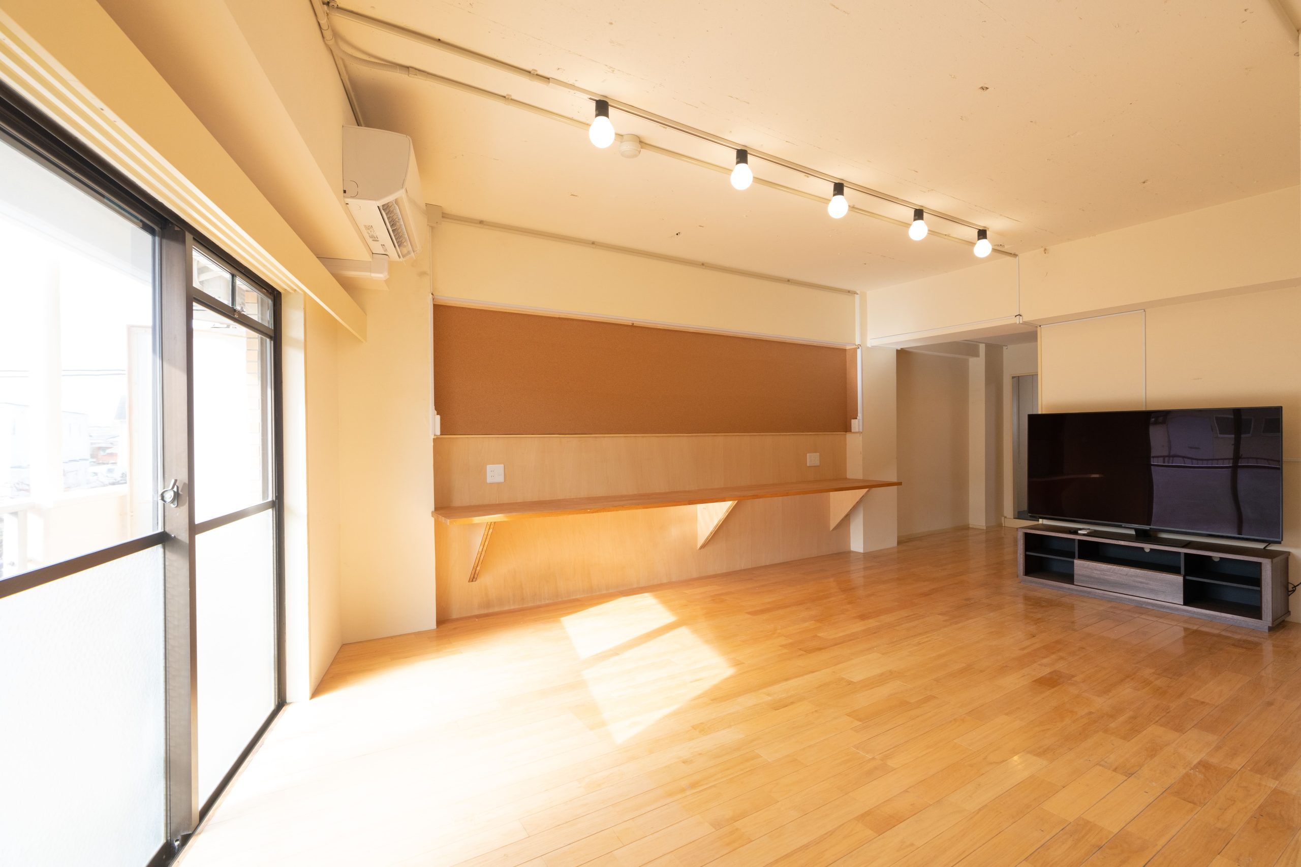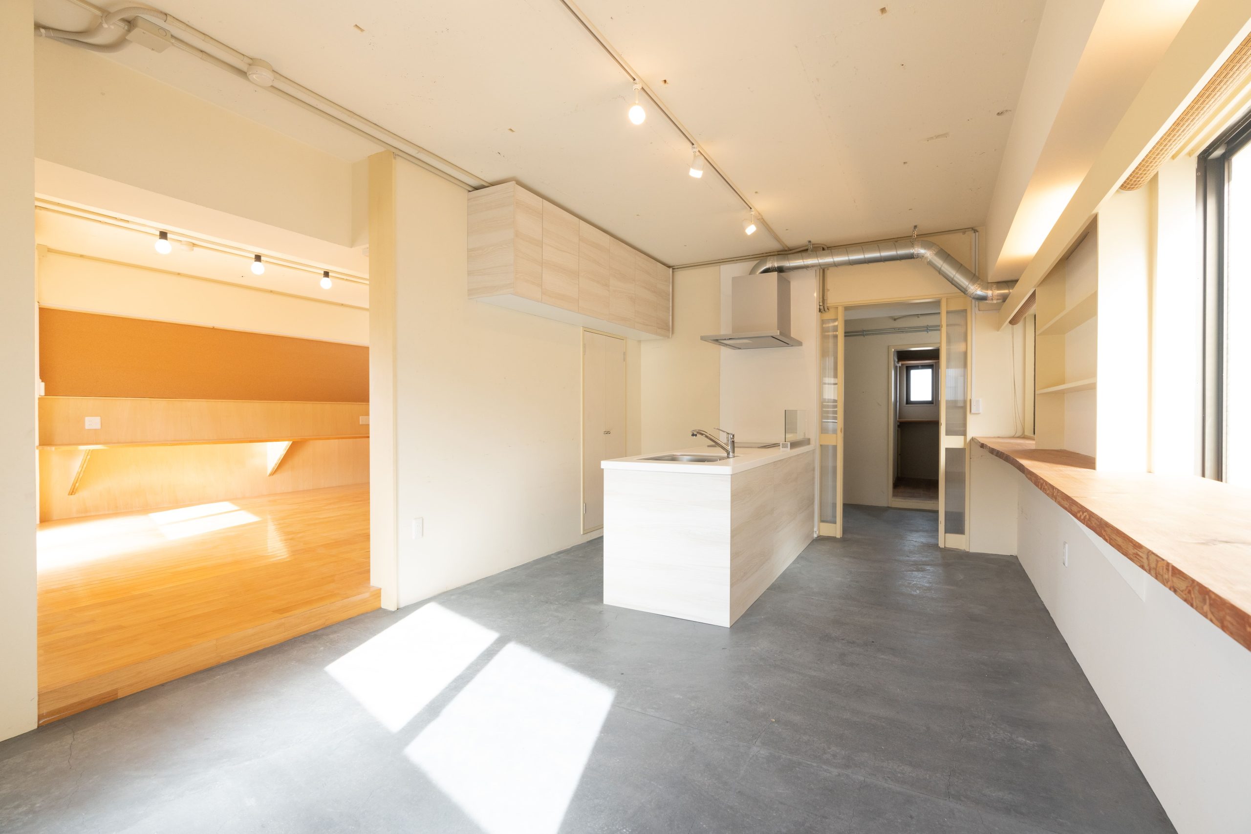 昭和の雰囲気が漂う室内をウッド調に全面改装し、暖色系のスポットライトで暖かみのあるお部屋に仕上げました。